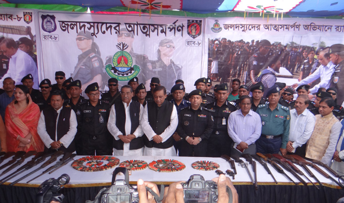 আত্মসমর্পণ করেন জলদস্যু বাহিনীর প্রধান মো. কবিরুল ইসলাম ওরফে খোকাবাবু (৩৩), মো. আমিনুর ইসলাম (৩২), মো. শাহজাহান গাজী (৩০), মো. আজিজ (৪৪), মো. মিজানুর রহমান (৩৬), মো. রবিউল ইসলাম (২৫), মো. ওসমান গনি (৩৩), মো. রফিকুল গাজী (৩৩), মো. ইয়াছিন আলী গাজী (২৫), মো. মহিদুল ইসলাম (৩৩), মো. মজিবর রহমান (৩৮) এবং মো. কালাম (৩৫)। এসময় তারা ৬টি বিদেশী একনালা বন্দু, ৪টি বিদেশি দোনালা বন্দুক মিলিয়ে ২২টি আগ্নেয়াস্ত্র ও ১হাজার ৩ রাউন্ড কার্তুজ জমা দেন।