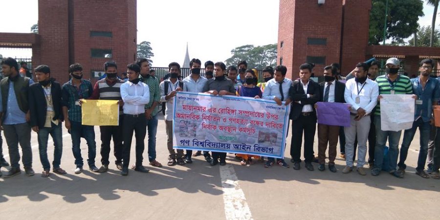 বিধান মুখার্জী, গণ বিশ্ববিদ্যালয় প্রতিনিধি : মিয়ানমারের আরাকান রাজ্যে সেনাবাহিনী কর্তৃক রোহিঙ্গা মুসলিম গণহত্যা, হামলা, নির্যাতন এবং দেশত্যাগে বাধ্য করার প্রতিবাদে ২৭ নভেম্বর রবিবার সকাল ১১ টায় মুখে কালো কাপড় বেঁধে সাভার জাতীয় স্মৃতিসৌধের সামনে নির্বাক অবস্থান নেন গণ বিশ্ববিদ্যালয়ের আইন বিভাগের শিক্ষার্থীরা । জাতীয় স্মৃতিসৌধের সামনে নির্বাক অবস্থানের মধ্যদিয়ে এই অমানবিক নিষ্ঠুরতা বন্ধে মিয়ানমার সরকার এবং জাতিসংঘসহ বিশ্বের মোড়ল দেশগুলোর সুদৃষ্টি কামনা করেন তারা।