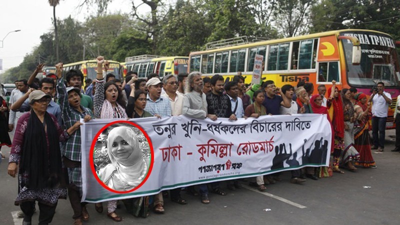 কুমিল্লা সরকারি ভিক্টোরিয়া কলেজের শিক্ষার্থী ও নাট্যকর্মী সোহাগী জাহান (তনু) হত্যার প্রতিবাদ ও বিচারের দাবিতে ঢাকার শাহবাগ থেকে কুমিল্লা অভিমুখে রোডমার্চ করছে গণজাগরণ মঞ্চ।