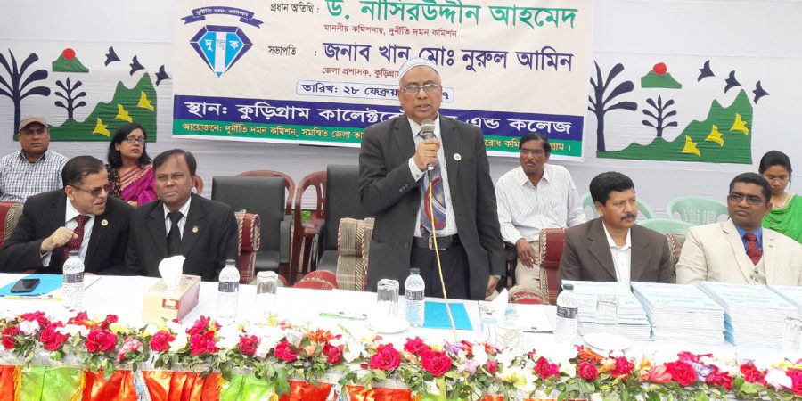 কুড়িগ্রাম প্রতিনিধি : কুড়িগ্রামে দুর্নীতি প্রতিরোধে সততা সংঘের ভূমিকা শীর্ষক আলোচনা সভা ও শিক্ষা উপকরণ বিতরণ করা হয়েছে। মঙ্গলবার সকালে কুড়িগ্রাম কালেক্টরেট স্কুল মাঠ প্রাঙ্গনে অনুষ্ঠিত আলোচনা সভায় প্রধান অতিথি হিসেবে উপস্থিত ছিলেন দুর্নীতি দমন কমিশনের কমিশনার ড. নাসিরউদ্দীন। জেলা প্রশাসক খান মো: নুরুল আমিনের সভাপতিত্বে বক্তব্য রাখেন দুদকের রাজশাহী বিভাগের পরিচালক আবদুল আজিজ ভূঁইয়া, জেলা দুর্নীতি প্রতিরোধ কমিটির সভাপতি একেএম সামউল হক নান্টু, সাধারণ সম্পাদক অধ্যক্ষ হারুন-অর-রশীদ প্রমুখ। দুদক ও জেলা দুপ্রক আয়োজিত অনুষ্ঠানে শিক্ষার্থীদের নিয়ে শপথ বাক্য পাঠ, দুর্নীতি বিরোধী শ্লোগান সম্বলিত খাতা বিতরণ ও বৃক্ষরোপন করা হয়।