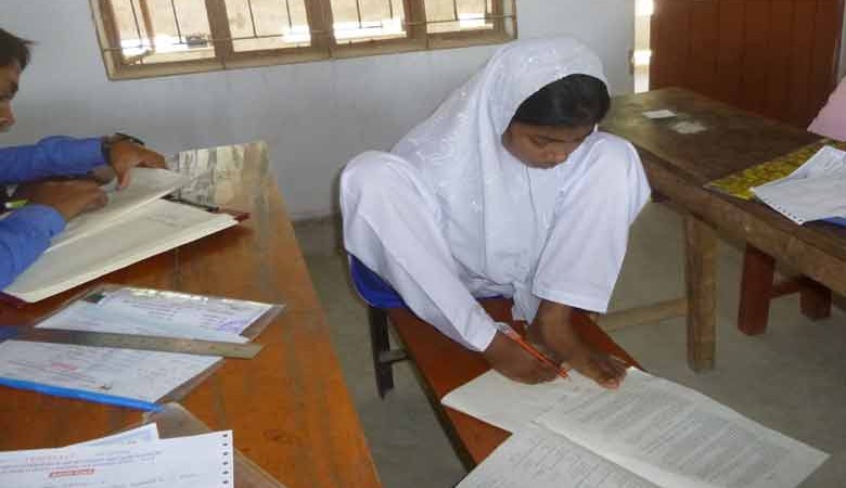 পা দিয়ে লিখে জেএসসি পরীক্ষা দিচ্ছে বিউটি