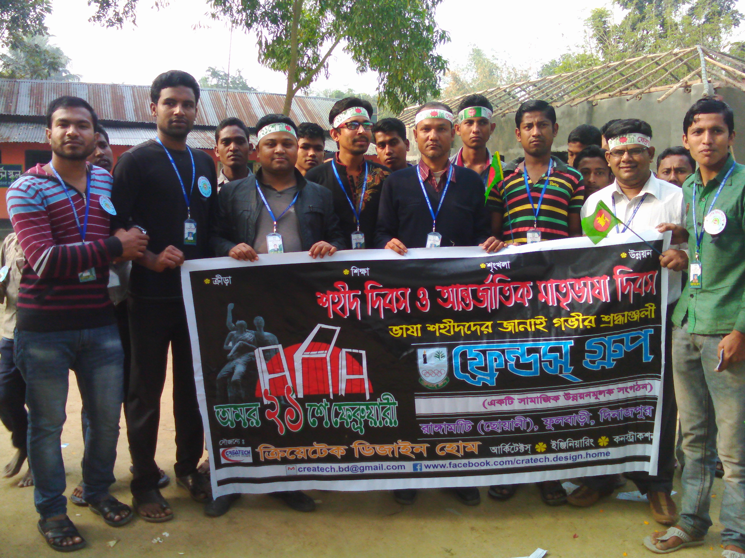 দিনাজপুরের ফুলবাড়ীতে বিজিবি ক্যাম্প সংলগ্ন রাঙ্গামাটি ছোয়ানীতে ২১ ফেব্রুয়ারী শনিবার ফ্রেন্ডস্ গ্রুপ (একটি সামাজিক উন্নয়ন মূলক সংগঠন) এর আয়োজনে জাতীয় শহীদ দিবস ও আন্তর্জাতিক মাতৃভাষা দিবস পালন করা হয়েছে।