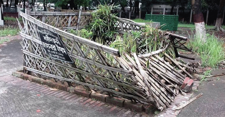 ছবিতে দেখা যায় জাহানারা ইমামের কবরটি ঘিরে দেয়া বাঁশের বেড়া একপাশে প্রায় সম্পূর্ণ ভেঙে পড়েছে।