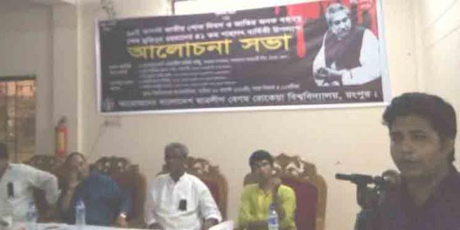 বিশ্ববিদ্যালয় শাখা ছাত্রলীগের সাধারন সম্পাদক মোস্তফা মাহমুদ হাসানের সঞ্চালনায় এবং বিশ্ববিদ্যালয় শাখা ছাত্রলীগের সভাপতি মেহেদি হাসান শিশিরের সভাপতিত্বে আলোচনা সভায় প্রধান অতিথি হিসেবে রংপুর মহানগর আওয়ামীলীগের সভাপতি সাফিউর রহমান সাফি , রংপুর জেলা আওয়ামীলীগের সাধারন সম্পাদক রেজাউল করীম রাজু, বেরোবি ছাত্রলীগের সিনিয়র সহ-সভাপতি আরিফুল ইসলাম প্রমুখ বক্তব্য রাখেন।