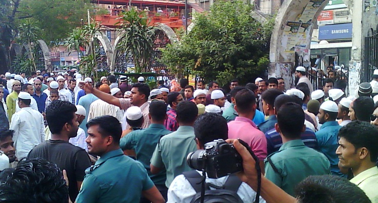 গত কয়েক সপ্তাহের ধারাবাহিকতায় শুক্রবারও বায়তুল মোকাররমের সামনে বিক্ষোভের ডাক দিয়েছিল ধর্মভিত্তিক সংগঠনটি। তবে তার আগেই এই এলাকায় অবস্থান নেয় বিপুল সংখ্যক পুলিশ। সম্ভাব্য গোলযোগ ঠেকাতে তাদের প্রস্তুতিও ছিল দেখার মত। হেফাজতের কর্মীরা জড়ো হওয়ার চেষ্টা করতেই বাধা দিয়েছে তারা। এ সময় বেশ কয়েকজনকে আটকের অভিযোগও করেছে হেফাজত।