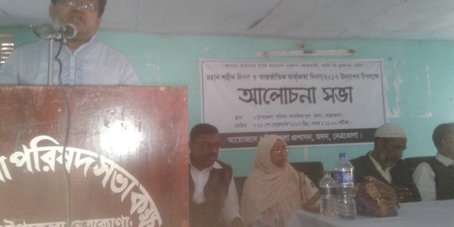প্রতিনিধি, মদন (নেত্রকোনা) : নেত্রকোনার মদন উপজেলা প্রশাসনের উদ্যোগে মঙ্গলবার পাবলিক হলে ভাষা শহীদদের স্বরণে উপজেলা নির্বাহী অফিসার মোঃ খুরশীদ শাহরিয়রের সভাপতিত্বে এক আলোচনা সভা অনুষ্ঠিত হয়। এতে বক্তব্য রাখেন, মুক্তিযোদ্ধা কমান্ডার হেলাল উদ্দিন তালুকদার, সহকারী কমিশনার (ভূমি) মোঃ আরিফুর রহমান, ওসি মোহাম্মদ মাজেদুর রহমান,উপজেলা আওয়ামীলীগের সভাপতি আব্দুল কদ্দুছ, জেলা পরিষদ সদস্য সাইফুল ইসলাম হান্নান, জেলা পরিষদ সদস্যা প্রধান শিক্ষক আয়েশা আক্তার, সাবেক আওয়ামীলীগের সভাপতি রুকন উদ্দিন আহম্মদ, সভাপতি মদন প্রেসক্লাব মো ঃ আল-আমীন তালুকদার ও মুক্তিযোদ্ধা কাজী শাহজাহান প্রমূখ।