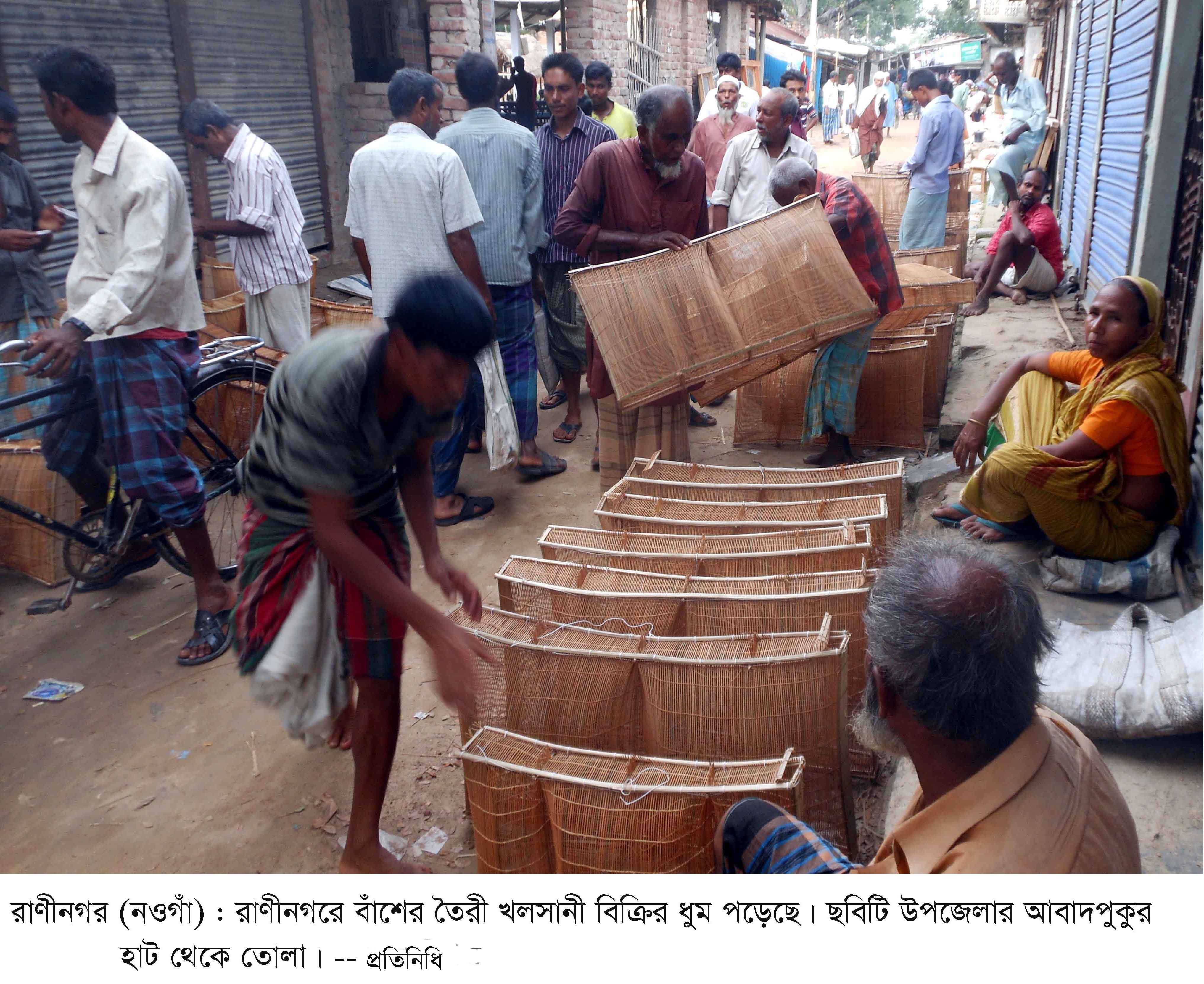 প্রতি বছর বর্ষা এলেই জমে উঠে নওগাঁর রাণীনগর উপজেলার আবাদপুকুর, ত্রিমোহনী, বেতগাড়ীসহ ঐতিহ্যবাহী খলই ও খলসানি হাটি। আষাঢ়-শ্রাবনের প্রবল বর্ষনে চারিদিকে নদী-নালা, খাল-বিল যখন পানিতে থৈ থৈ করে, তখন জেলে সম্প্রদায় সদর,গ্রামবাংলার মৎস্য শিকারীদের লেগে যায় মাছ ধরার ধুম। জেলে সম্প্রদায়েরা জাল দিয়ে মাছ শিকার করলেও আজও গ্রামবাংলার অনেকেই বাঁশের তৈরি বিশেষ ধরনের এই খলই কিংবা খলসানী ব্যবহার করে নদী-নালা,খাল-বিলে মাছ শিকার করতে ব্যস্ত হয়ে পড়ে। অনেকেরই মৎস্য শিকার এক ধরনের নিশা। এজন্য আষাঢ় ও শ্রাবণ দুই মাস ধরে অস্থায়ী ভিত্তিত্বে আবাদপুকুর, ত্রিমোহনী ও বেতগাড়ীতে প্রতিবছরই এই ঐতিহ্যবাহী খলই কিংবা খলসানী হাটটি যুগযুগ ধরে ঐতিহ্য ধারণ করে আসছে। বাঁশ শিল্পের এ খলই এবং খলসানী তৈরী করে আজও বেঁচে আছে ঝিঁনা, হরিপুর, নিজামপুর, খট্রেশ্বর ও পাশ্ববর্তী চাঁপাপুরসহ বিভিন্ন এলাকার প্রায় ২শতাধিক পরিবার। তারা তাদের স্ত্রী, পুত্র কন্যাসহ পরিবারের সকল সদস্যরা মিলে এই অবসর মৌসুমে তাদের নিপুণ হাতের তৈরি এসব খলসানি তৈরি করে বাড়ি থেকে নিয়ে এসে আবাদপুকুর, ত্রিমোহনী, বেতগাড়ীসহ বিভিন্ন হাটে নিয়ে আসে এবং বেচাকেনা করে। বাঁশ কটের সুতা এবং তাল গাছের সাঁশ দিয়ে তৈরি এসব খলসানি মানের দিক দিয়ে ভালো হওয়ায় স্থানীয় চাহিদা মিটিয়ে দেশের অঞ্চল ভেদে বিশেষ করে হাওর অঞ্চলে মাছ শিকারীরা এখান থেকে পাইকারি মূল্যে কিনে ট্রাক দিয়ে খলসানি নিয়ে যায়। ফলে এখানকার খলসানি তৈরির সাথে জড়িত পরিবারগুলো বর্ষা মৌসুমে এর কদর বেশি ও যথাযথ মূল্য পাওয়ায় মাত্র দুই তিন মাসেই খলসানি বিক্রি করেই তারা প্রায় বছরের খোরাক ঘরে তুলে নেয়। লাভ খুব বেশি না হলেও বর্ষা মৌসুমে এর চাহিদা থাকায় রাত-দিন পরিশ্রমের মাধ্যমে খলসানি তৈরি করে তারা বেজাই খুশি। এক দিকে যেমন সময় কাটে অন্য দিকে লাভের আশায় বাড়ির সকল সদস্যরা মিলে খলসানি তৈরির কাজ করে অভাবের কবল থেকে একটু সুখের নিশ্বাস ফেলে। এসব খলসানি তৈরিতে প্রকার ভেদে খরচ হয় ৭০থেকে ২শ’ টাকা, বিক্রি হয় ১০০ থেকে ৩”শ’ টাকা পর্যন্ত বিক্রি হচ্ছে। এতে করে খুব বেশি লাভ না হলেও পৈত্রিক এই পেশা ছাড়তে তারা নারাজ। আধুনিকতার উৎকর্ষের তৈরি ছোট জাতের মাছ ধরার সূতি, ভাদাই, ও কারেন্ট জালের দাপটের কারণে দেশি প্রযুক্তির বাঁশের তৈরি খলসানি সামগ্রী এমনিতেই টিকে থাকতে পারছে না। কিন্তু জীবন জীবিকার তাগিদে তারা একেবারে কর্মহীন থাকতেও চায় না। তবে সরকারি ও বেসরকারী পৃষ্ঠপোষকতা ও ঋণ সহযোগীতা পেলে মৌসুমের আগে বেশি পরিমাণ খলসানি মজুত করতে পারলে ভরা মৌসুমে বেশি দামে বিক্রি হলে লাভ ভালো হয়। উপজেলার নিজামপুর গ্রামের খলই বা খলসানী তৈরি ও বিক্রেতা শ্রী সুদাম জানান, আমি প্রতি 
