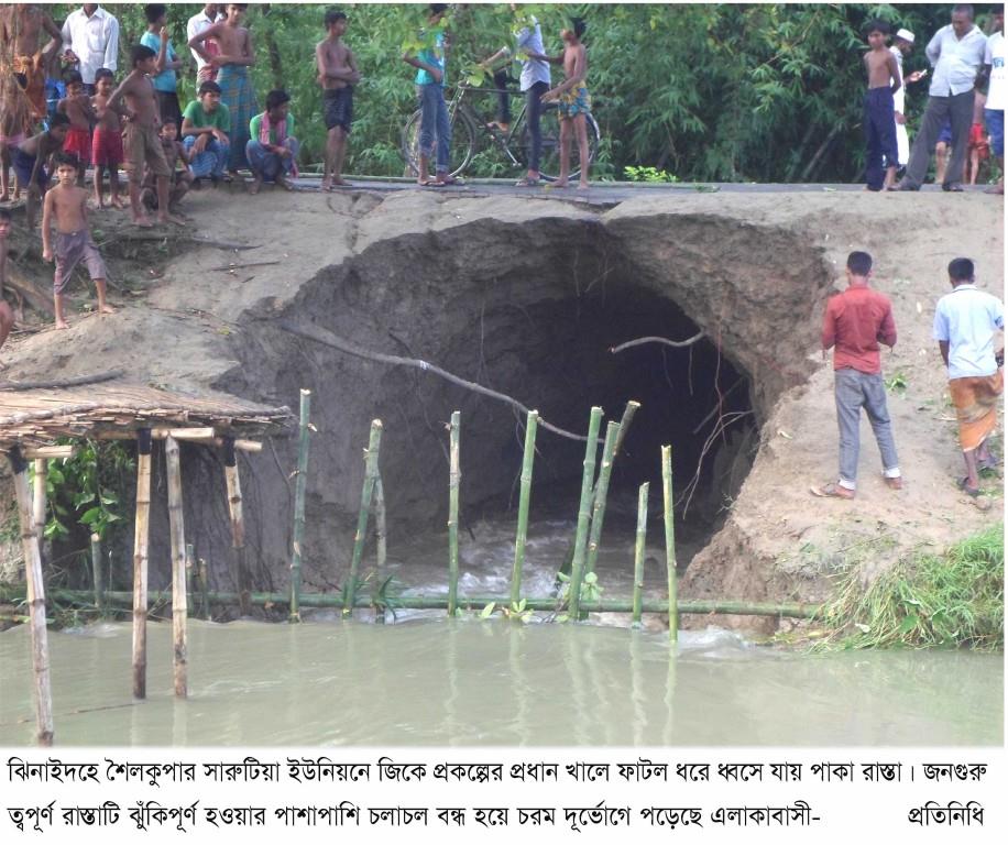 ঝিনাইদহে শৈলকুপার সারুটিয়া ইউনিয়নে গঙ্গা-কপোতাক্ষ সেচ খাল ভেঙ্গে যাওয়ায় জনদূর্ভেগে পড়েছে এলাকাবাসী। পাউবোর কর্মকর্তাদের যোগসাজসে পানি উন্নয়ন বোর্ডের জনগুরুত্বপূর্ণ প্রধান খালটি পানির চাপে ভেঙ্গে গেছে বলে এলাকাবাসীর অভিযোগ। তাদের ভাষ্য মতে পকল্প পরিচালক ওয়াহিদুজ্জামানের পছন্দের ঠিকাদারকে অধিক লাভবান করার উদ্দেশ্যে ঘটনাস্থলে পাউবোর শতাধীক শ্রমিক থাকলেও সেচ খালের এই ভাঙ্গন রোধে কোন কার্যকর পদক্ষেপ গ্রহন করা হয়নি।