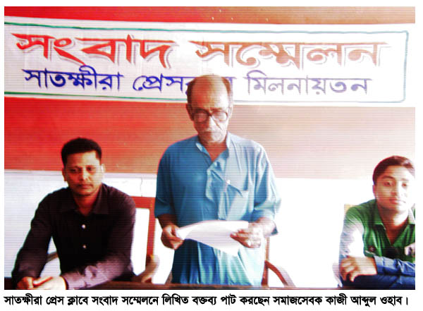 স্বাক্ষর জাল করার প্রতিবাদে এক সংবাদ সম্মেলন করেছেন এক বিশিষ্ট সমাজসেবক। সোমবার বিকেলে সাতক্ষীরা প্রেসক্লাবে অনুষ্ঠিত সংবাদ সম্মেলনে লিখিত বক্তব্য পাঠ করেন কলারোয়া উপজেলার মৃত কাজী আব্দুল মান্নানের পুত্র সমাজসেবক কাজী আব্দুল ওহাব। লিখিত বক্তব্য তিনি বলেন, তার স্বাক্ষর জাল করে একখানা অভিযোগ পত্র শেখ আমানুল্লাহ ডিগ্রী কলেজের প্রভাষক মোঃ সোলায়মান হোসেনের বিরুদ্ধে উক্ত কলেজের ভারপ্রাপ্ত অধ্যক্ষের মাধ্যমে কলেজের সভাপতি মহোদয়ের নিকট দায়ের করেছে কতিপয় ব্যক্তিরা। উক্ত অভিযোগের ফটো কপি হাতে পেয়ে জানতে পারলাম যে, অভিযোগে ১/৪নং ক্রমিকে তার নৈতিক অবক্ষয় জনিত যে সকল উক্তি করা হয়েছে তা সবই মিথ্যা ভিক্তিহীন,বানোয়াট ও কাল্পনিক কাহিনী মাত্র। আমি সংবাদ সম্মেলনে অত্যন্ত দুঃখের সঙ্গে জানাচ্ছি যে, বিগত কয়েক দিন পূর্বে শেখ আমানুল্লাহ ডিগ্রী কলেজের একজন প্রভাষক আমার নিটক এসে প্রভাষক মোঃ সোলায়মান হোসেনের বিরুদ্ধে দায়েরকৃত একটি অভিযোগ পত্রে স্বাক্ষর করতে বললে আমি রাজী হইনি। পরবর্তীতে কেউ আমার জাল স্বাক্ষর ব্যবসহার করে ওই অভিযোগপত্র দায়ের করেছে। আমার জানা মতে,প্রভাষক মোঃ সোলায়মান হোসেন একজন অত্যন্ত ভাল শিক্ষক ও সৎ চরিত্রবান মানুষ। সংবাদ সম্মেলনে সাংবাদিক ভাইদের সত্য ঘটনা প্রকাশের জন্য আবেদন জানান সমাজসেবক কাজী আ.ওহাব।