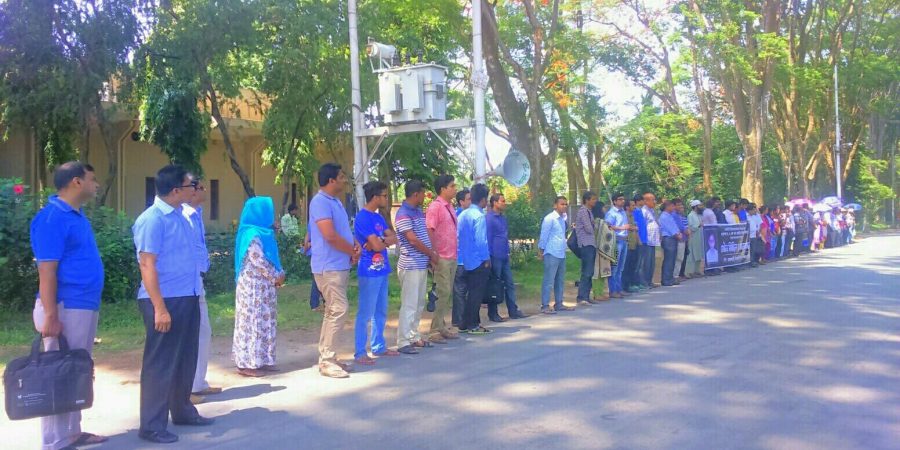 শিক্ষক সমিতির যুগ্ম সম্পাদক অধ্যাপক ড. ইসমাইল হোসেনের সঞ্চালনায় মানববন্ধনে অন্যদের মধ্যে বক্তব্য দেন, শিক্ষক সমিতির সভাপতি ড. মো. শহীদুল্লাহ্, সাধারণ সস্পাদক ড. শাহ্ আজম ও ফলিত রসায়ন ও রসায়ন প্রকৌশল বিভাগের দিলীপ কুমার সরকার। মানববন্ধন থেকে আরো জানানো হয় পরবর্তী ঘোষণা না দেওয়া পর্যন্ত এ মানববন্ধন কর্মসূচি অব্যাহত থাকবে।