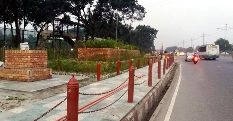সরেজমিনে দেখা যায়, অত্যাধুনিক লোহা, স্টিল মিশ্রিত বার, শিকল বসানো ও ঝালাইয়ের কাজ করছেন শ্রমিকরা। ফুটপাতসংলগ্ন নির্ধারিত কিছুটা উঁচু স্থানে ইট-পাথর দিয়ে তৈরি করা হচ্ছে নানা আল্পনা। আল্পনার ফাঁকে ফাঁকে তৈরি করা হচ্ছে মুক্তিযুদ্ধের বিভিন্ন স্মৃতিস্তম্ভ। সাজানো হচ্ছে নানা রকমের ফুলের টব।