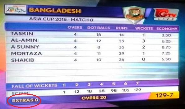 আর এই ম্যাচেই প্রথমবারের মত টি-টোয়েন্টি ক্রিকেটে ঘটলো অভাবনীয় এক ঘটনা। এবারই প্রথম টি-টোয়েন্টি ক্রিকেটের কোন ইনিংসে অতিরিক্ত খাত থেকে কোন রান আসলো না। আর ‘অনন্য’ এই রেকর্ডের কৃতীত্ব অবশ্যই বাংলাদেশি বোলারদের।