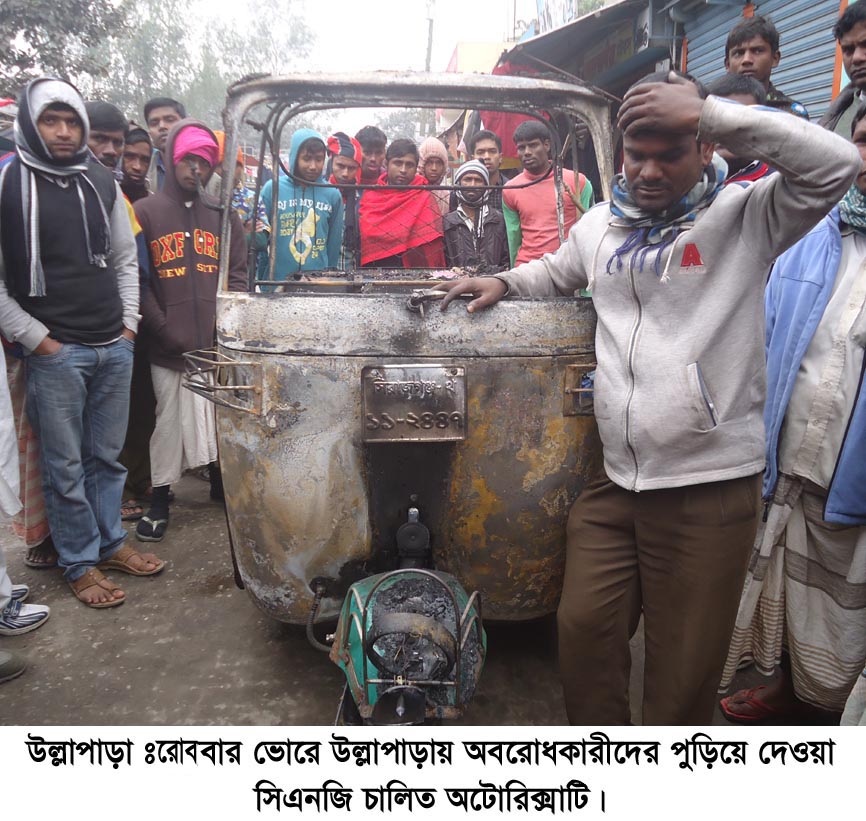 রোববার ভোর সাড়ে ৭ টার দিকে বগুড়া-নগড়বাড়ী মহা সড়কে উল্লাপাড়া পৌর শহরের বিজ্ঞান কলেজের পাশে অবরোধকারীরা যাত্রীবাহী সিএনজি চালিত একটি অটোরিক্সা পুড়িয়ে দিয়েছে। অটোরিক্সাটি উল্লাপাড়া থেকে সিরাজগঞ্জ রোডে যাচ্ছিল।