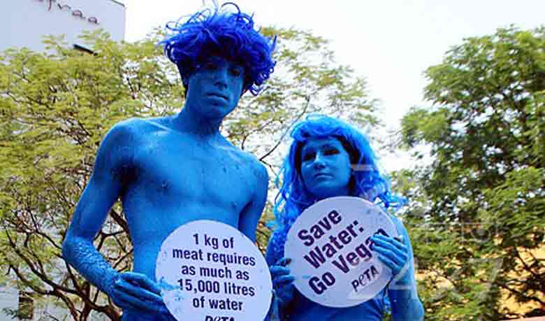 ‘ওয়াটার ফুটপ্রিন্ট নেটওয়ার্ক’-এর এক সমীক্ষা অনুয়ায়ী ১ কেজি সব্জির জন্য মোট পানির পরিমান যেখানে ৩২২ লিটার সেখানে ১ কেজি পোলট্রির জন্য পানির খরচ প্রায় ৪৩২৫ লিটার। অন্যান্য ক্ষেত্রে এই পানির পরিমাণ ক্রমাগত বাড়ে। পানির সংকট দিনদিনই সারা বিশ্বকেই জীবনের অস্তিত্ব রক্ষার সংকটের মুখে ঠেলে দিচ্ছে। এহেন পরিস্থিতিতে পানি বাঁচানোর প্রয়াসের সঙ্গে খাদ্য হিসেবে মাংস না খাওয়াও এক সূত্রে মিলিয়ে দেওয়ার বার্তা দিলেন জোড়া নীল নারী-পুরুষ। এতে পানির সাশ্রয় যেমন হবে, তেমনই প্রাণীরাও ক্রমাগত খাদ্য হয়ে ওঠা থেকে রক্ষা পাবে।