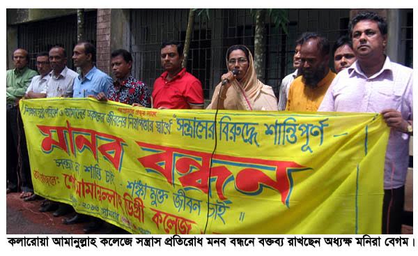 জুলফিকার আলী, কলারোয়া (সাতক্ষীরা) প্রতিনিধিঃ সন্ত্রাস নয়, শান্তি চাই শৃঙ্খলামুক্ত জীবন চাই এই স্লোগানকে সামনে বেখে সোমবার সকাল ১০টা থেকে বেলা ১১টা পর্যন্ত সন্ত্রাস প্রতিরোধে মনব বন্ধন কর্মসূচি পালন করেছে কলারোয়ার ঐতিহ্যবাহী শিক্ষা প্রতিষ্ঠান শেখ আমানুল্লাহ ডিগ্রী কলেজের সকাল শিক্ষক ও শিক্ষার্থীবৃন্দ।