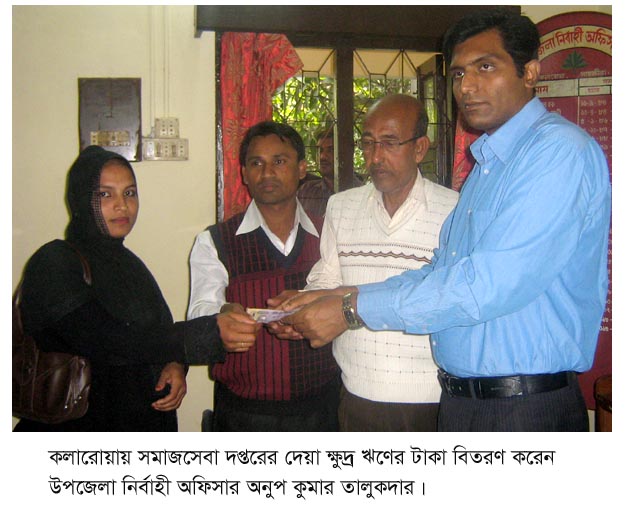 কলারোয়ায় স্বাবলম্বিতা সৃষ্টিতে প্রতিবন্ধিসহ প্রান্তিক দারিদ্র মানুষের মাঝে সুদমুক্ত ক্ষুদ্র ঋণ বিতরণ করা হয়েছে। উপজেলা সমাজসেবা দপ্তরের প্রকল্পভূক্ত গ্রামের সদস্য ও সদস্যাদের মাঝে বৃহষ্পতিবার দুপুরের দিকে সুদমুক্ত এ ক্ষুদ্র ঋণ প্রদান করা হয়। ১৩ জন প্রতিবন্ধিসহ ১২০ জনের মধ্যে দু’দফায় ১৩ লাখ ৩৫ হাজার টাকা বিতরণ করা হয়। এই ঋণের টাকা গাভী পালন, ছাগল পালন, মাছ চাষ, দর্জি কাজ ও হাঁস-মুরগী পালনের জন্য দেয়া হয়েছে। উপজেলা নির্বাহী অফিসারের কার্যালয়ে ঋণের নগদ টাকা বিতরণ করেন ইউএনও অনুপ কুমার তালুকদার। এসময় উপস্থিত ছিলেন সমাজসেবা কর্মকর্তা শেখ ফারুক হোসেন, কলারোয়া প্রেসক্লাবের সভাপতি গোলাম রহমান, সমাজসেবক কাজী আব্দুল ওহাব, ইমাদুল হক, হুমায়ুন কাদির, আলহাজ্ব আব্দুস সামাদ, নাসরিন আক্তার, সাংবাদিক এমএ সাজেদ প্রমুখ।