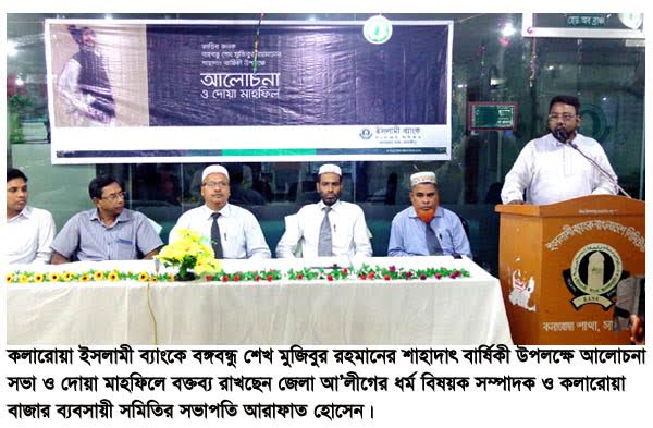 ইসলামী বাংকের কলারোয়া শাখা ব্যবস্থাপক মোঃ আবুল হোসেনের সভাপতিত্বে আলোচনা ও দোয়া অনুষ্ঠানে প্রধান অতিথি হিসাবে উপস্থিত থেকে বক্তব্য রাখেন, জেলা আওয়ামীলীগের ধর্ম বিষয়ক সম্পাদক ও কলারোয়া বাজার ব্যবসায়ী সমিতির সভাপতি আরাফাত হোসেন।