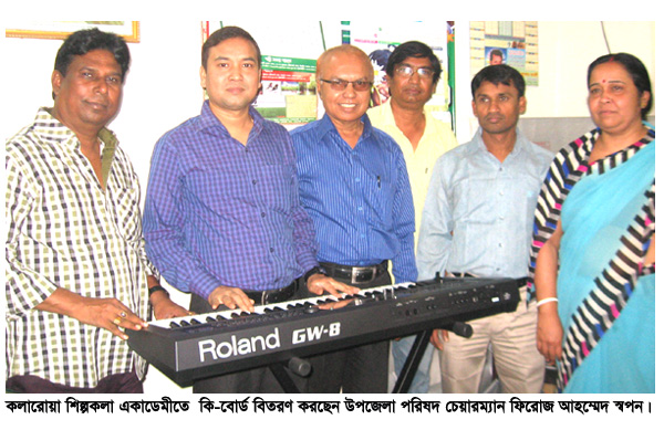 কামরুল হাসান, কলারোয়া : সাতক্ষীরার কলারোয়া শিল্পকলা একাডেমীতে গানের সুর ও তাল মেলাতে একটি ডিজিটাল কি-বোর্ড প্রদান করেছে উপজেলা পরিষদ। বুধবার বেলা ১২টায় উপজেলা পরিষদ চেয়ারম্যানের অফিস কক্ষে এক অনুষ্ঠানে এ ডিজিটাল কি-বোর্ড প্রদান করা হয়। উপজেলা চেয়ারম্যান ফিরোজ আহম্মেদ স্বপন প্রধান অতিথি হিসাবে উপস্থিত থেকে উপজেলা শিল্পকলা একাডেমীর শিক্ষক শিলা রাণী হালদারের হাতে এ বৈদ্যুতিক ডিজিটাল কি-বোর্ড তুলে দেন। এ সময় উপস্থিত ছিলেন উপজেলা নির্বাহী কর্মকর্তা উত্তম কুমার রায়, উপজেলা এলজিইডি কর্মকর্তা আবেদুর রহমান, উপজেলা সমাজসেবা কর্মকর্তা শেখ ফারুক হোসেন, কলারোয়া পাবলিক ইনস্টিটিউটের সাধারণ সম্পাদক এড.শেখ কামাল রেজা প্রমুখ।