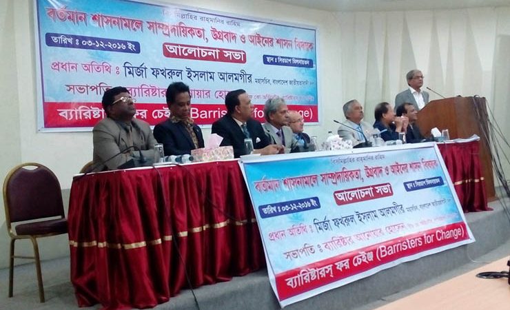 শনিবার দুপুরে রাজধানীর সিরডাপ মিলনায়তনে ব্যারিস্টারস্ ফর চেইঞ্জ আয়োজিত ‘বর্তমান শাসনামলে সাম্প্রদায়িকতা, উগ্রবাদ ও আইনের শাসন’ শীর্ষক আলোচনা সভায় ফখরুল এসব কথা বলেন।