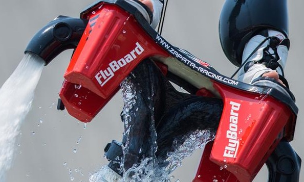 সঙ্গে ‘ফ্লাইবোর্ড’ থাকলে তীব্র গতিতে পানি থেকে ছিটকে বেরিয়ে আকাশের দিকে ধেয়ে যাওয়া অসম্ভব নয়৷ দুই হাতে জেট, পায়ের নীচেও পাইপে লাগানো জেট জুতো৷