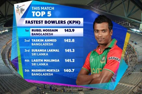 তবে, এটা ছাড়া আরেকটা দিক থেকে রুবেল শুধু বাংলাদেশেরই নয়, ম্যাচে বল করা সব লঙ্কান বোলারদেরও ছাড়িয়ে গেছেন। দিনের সবচেয়ে গতিশীলল বলটা এসেছে তার হাত থেকেই। সেটার গতি ছিল ঘণ্টা প্রতি ১৪৩.৯। দ্বিতীয় স্থানেও আছেন একজন বাংলাদেশিই। তিনি হলেন তাসকিব আহমেদ। তার একটা বল এসেছিল ঘণ্টা প্রতি ১৪২.৮ কিলোমিটার বেগে।