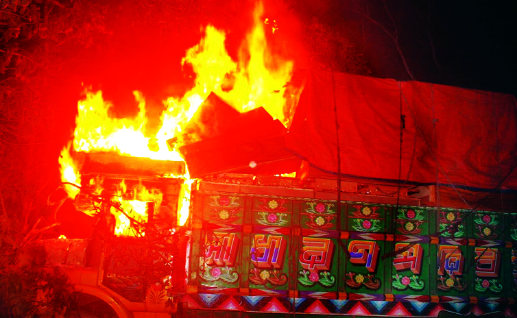 গাইবান্ধায় ভূট্টা বোঝাই দুই ট্রাকে আগুন