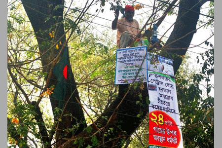 অন্য প্ল্যাকার্ডে লেখা ছিল—‘১৬ কোটি মানুষ এই মাটিতে দাঁড়িয়ে কথা বলার অধিকার হারিয়ে ফেলেছে। তাই গাছে উঠে দাবি আদায়ের কথা বলছি। দাবি আদায় হলে নিচে নেমে আসব।’