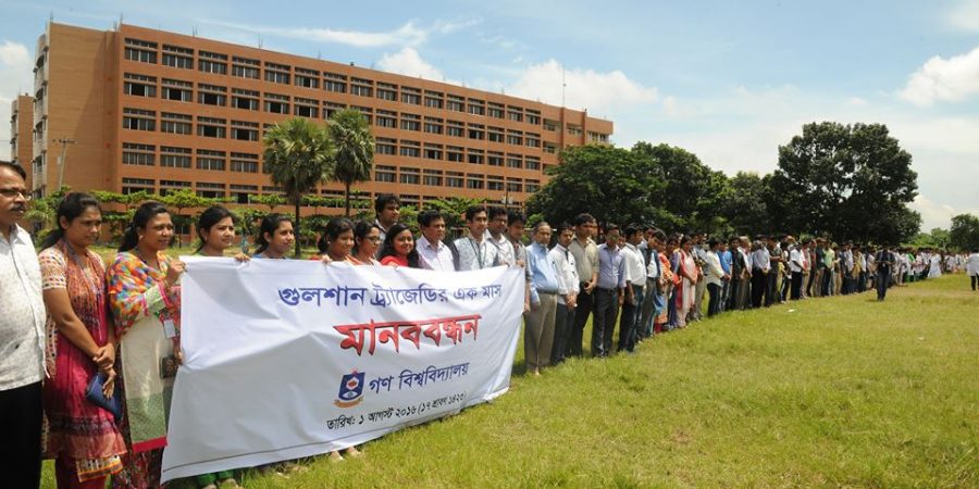 বিধান মুখার্জী, গণ বিশ্ববিদ্যালয় : ঢাকার গুলশানে সংঘটিত জঙ্গি হামলার এক মাস স্মরণে গণ বিশ্ববিদ্যালয় ও গণস্বাস্থ্য সমাজ ভিত্তিক মেডিকেল কলেজ এর যৌথ উদ্যোগে ১ আগস্ট সোমবার মানববন্ধন এবং আলোচনা সভা অনুষ্ঠিত হয়। সাভারে বিশ্ববিদ্যালয়টির নিজস্ব ক্যাম্পাসে গণ বিশ্ববিদ্যালয় কেন্দ্রীয় ছাত্র সংসদের সহযোগিতায় অনুষ্ঠিত মানববন্ধন কর্মসূচিতে বিভিন্ন বিভাগের কয়েক হাজার শিক্ষার্থী অংশগ্রহণ করে। এসময় বিভিন্ন অনুষদের ডীন, রেজিস্ট্রার, পরীক্ষা নিয়ন্ত্রক ও গণস্বাস্থ্য সমাজ ভিত্তিক মেডিকেল কলেজের অধ্যক্ষসহ বিভিন্ন বিভাগের প্রধান ও শিক্ষকগণ উপস্থিত ছিলেন।