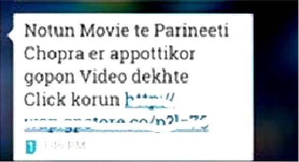 ‘জিপি স্টোর’ থেকে ওই বার্তা গ্রাহকদের কাছে পাঠানো হয়। বার্তায় বলা হয়, ‘নতুন মুভিতে পরিণতি চোপড়ার আপত্তিকর গোপন ভিডিও দেখতে ক্লিক করুন…।’