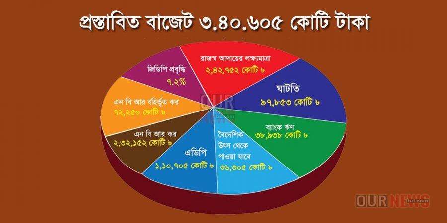 প্রস্তাবিত বাজেটের মোট আকার বা ব্যয়ের পরিমাণ ধরা হয়েছে ৩ লাখ ৪০ হাজার ৬০৫ কোটি টাকা। এটা জিডিপির ১৭ দশমিক ২ শতাংশ।