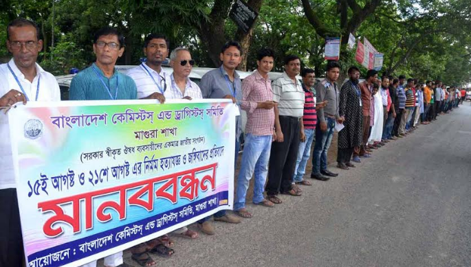 জঙ্গি ও সন্ত্রাসবাদের বিরুদ্ধে মাগুরা কেমিস্টস এন্ড ড্রাগিস্টস সমিতির মানববন্ধন