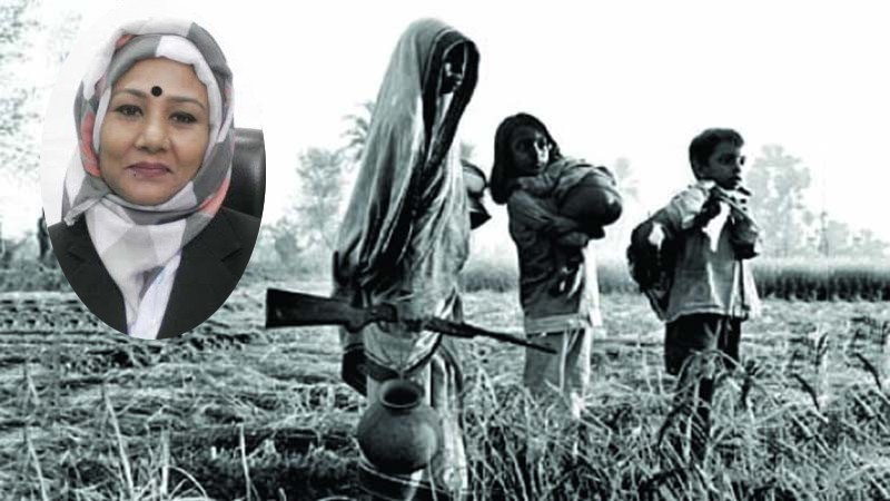 ‘আমি এভাবে ৮ মাস বন্দি থাকার পর গোলাগুলির শব্দ শুনতে পেলাম। আমি ভাবলাম হয়ত আমাদের দেশ স্বাধীন হচ্ছে। তারপর আমি দরজার কড়া নাড়তে থাকলাম। এভাবে কড়া নাড়তে নাড়তে দুই দিন পর আমার দরজা একজন খুলে দেয়। কিন্তু কে সেই দরজা খুলে দেয় তা আমার মনে নেই। সে আমাকে চা পাতা তোলার গাড়িতে করে নিয়ে আমার গ্রামের পাশে ফেলে রেখে চলে যায়। তখন শরীরে একটা ছেড়া পেটিকোট ছাড়া আমার আর কিছুই ছিলো না। তখন আমি গাছের আড়ালে লুকাই। মানুষের শব্দ শুনতে পেয়ে তাদের কাছে একটি কাপড় চাই। একজন আমাকে একটি লুঙ্গি দেয়। সেই লুঙ্গি আমি গায়ে জড়ানোর পর তাকে আমার সামনে আসতে বলি। তখন সে আমার সামনে আসে। কথা বলার খুব বেশি শক্তি না থাকলেও তখন তাকে দীর্ঘ ৮ মাসের নির্মমতার বর্ণনা দেই।’