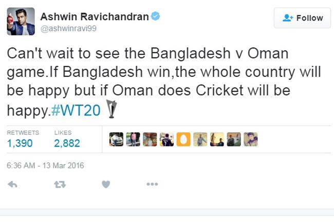 অশ্বিনের টুইটের পাঁচ মিনিটের মাথায় আজাদ নামে এক টুইটার ব্যবহারকারী তাঁকে উদ্দেশ্য করে লেখেন, ‘আপনি ওমানের বিজয় চান, কারণ আমার মনে হচ্ছে আপনি টাইগারদের মুখোমুখি হতে ভয় পাচ্ছেন।’