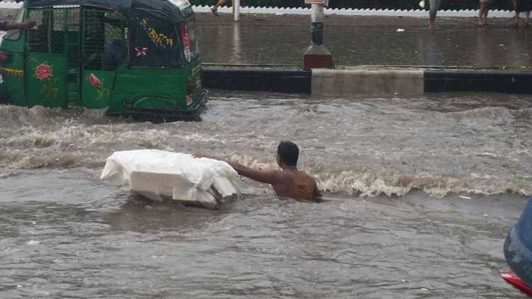 রাজধানীর রাস্তা প্লাবিত মানে গোঁড়ালি অথবা হাঁটু পর্যন্ত পানি-এতদিন এটাই জেনেছে রাজধানীবাসী। কিন্তু আজ তাদের পড়তে হল নতুন এক অভিজ্ঞতার সামনে। মিরপুর রোডের ধানমন্ডি-৩২ থেকে আসাদ গেট পর্যন্ত কোমর সমান পানি। কোথাও তার থেকে বেশি! সাইন্সল্যাব থেকে মিরপুরগামী রাস্তা পুরো থমকে আছে। মেট্রোর সামনে পানির এতটাই নাজেহাল অবস্থা যে, গাড়ি চলাচল করতে পারছে না।