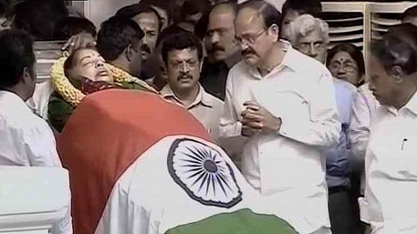 তামিলনাড়ুর ‘আম্মা’ খ্যাত প্রয়াত মুখ্যমন্ত্রী জে জয়ললিতার মরদেহ চেন্নাইয়ের অ্যাপোলো হসপিটাল থেকে প্রথমে তার পোজ গার্ডেনের বাসস্থান হয়ে রাজাজী হলে নেয়া হয়েছে। জাতীয় পতাকায় ঢাকা ভারতের সবচেয়ে ক্ষমতাশালী ও জনপ্রিয় রাজনীতিকদের একজন এই মুখ্যমন্ত্রীকে শেষ শ্রদ্ধা জানাতে সেখানে ভীড় করছেন হাজারো মানুষ।