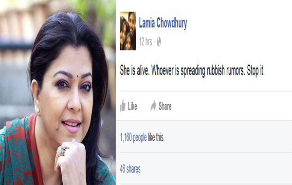 লামিয়া ফেসবুকে একটি স্ট্যাটাসের মাধ্যমে গুজব ছড়ানো বন্ধ করতে বলেন। তিনি লেখেন, “তিনি বেঁচে আছেন। যারা এসব ফালতু গুজব ছড়াচ্ছেন, বন্ধ করুন।”