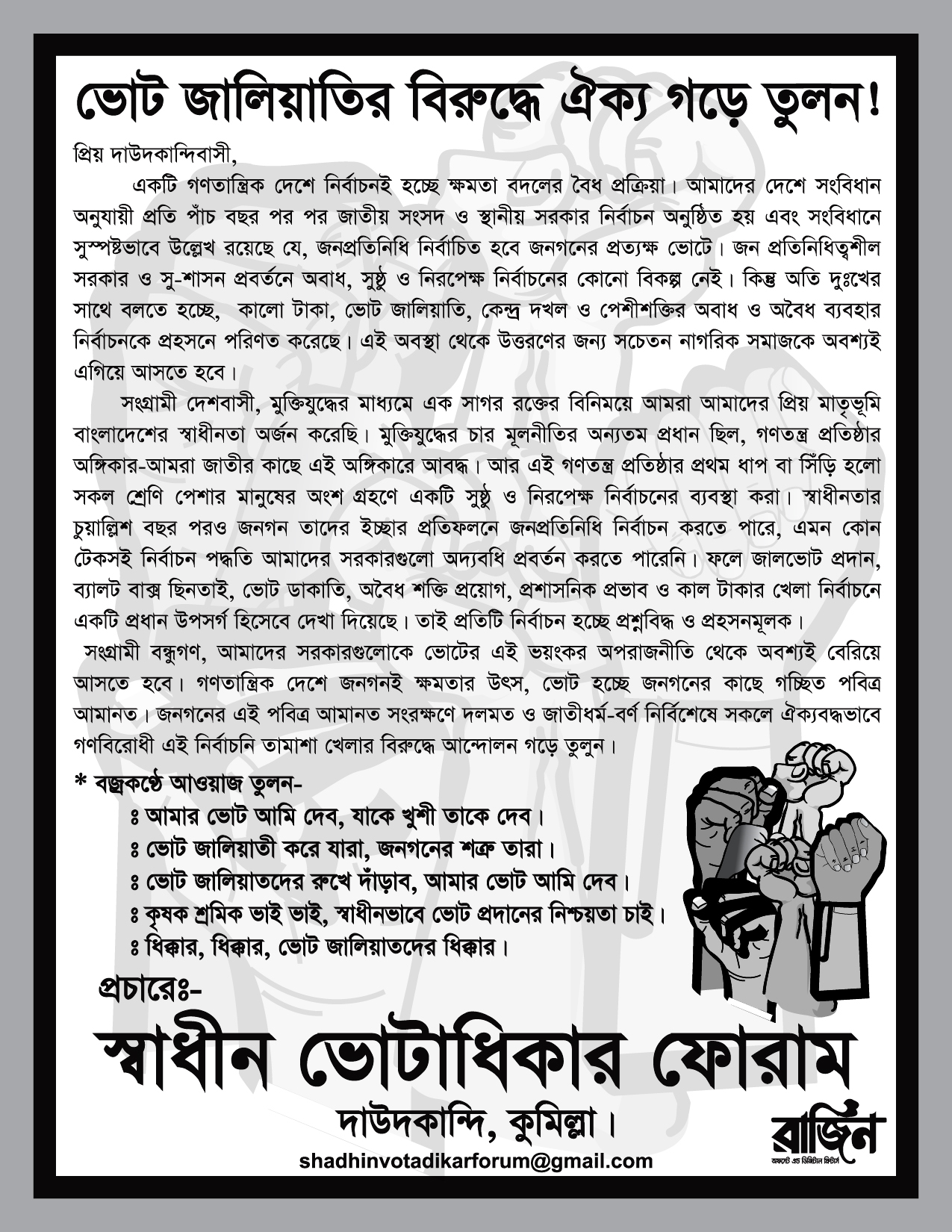 সংগ্রামী বন্ধুগণ, আমাদের সরকারগুলোকে ভোটের এই ভয়ংকর অপরাজনীতি থেকে অবশ্যই বেরিয়ে আসতে হবে। গণতান্ত্রিক দেশে জনগনই ক্ষমতার উৎস, ভোট হচ্ছে জনগনের কাছে গচ্ছিত পবিত্র আমানত। জনগনের এই পবিত্র আমানত সংরক্ষণে দলমত ও জাতী-ধর্ম-বর্ণ নির্বিশেষে সকলে ঐক্যবদ্ধভাবে গণবিরোধী এই নির্বাচনী তামাশার খেলার বিরুদ্ধে আন্দোলন গড়ে তুলুন। বজ্রকণ্ঠে আওয়াজ তুলন-#আমার ভোট আমি দেব, যাকে খুশী তাকে দেব।#ভোট জালিয়াতী করে যারা, জনগনের শত্র“ তারা। #ভোট জালিয়াতদের রুখে দাঁড়াব, আমার ভোট আমি দেব।# কৃষক শ্রমিক ভাই ভাই, সুষ্ঠুভাবে ভোট প্রদানের নিশ্চয়তা চাই। ধিক্কার, ধিক্কার, ভোট জালিয়াতদের ধিক্কার। প্রচারেঃ- স্বাধীন ভোটাধিকার ফোরাম, দাউদকান্দি, কুমিল্ল¬া।’