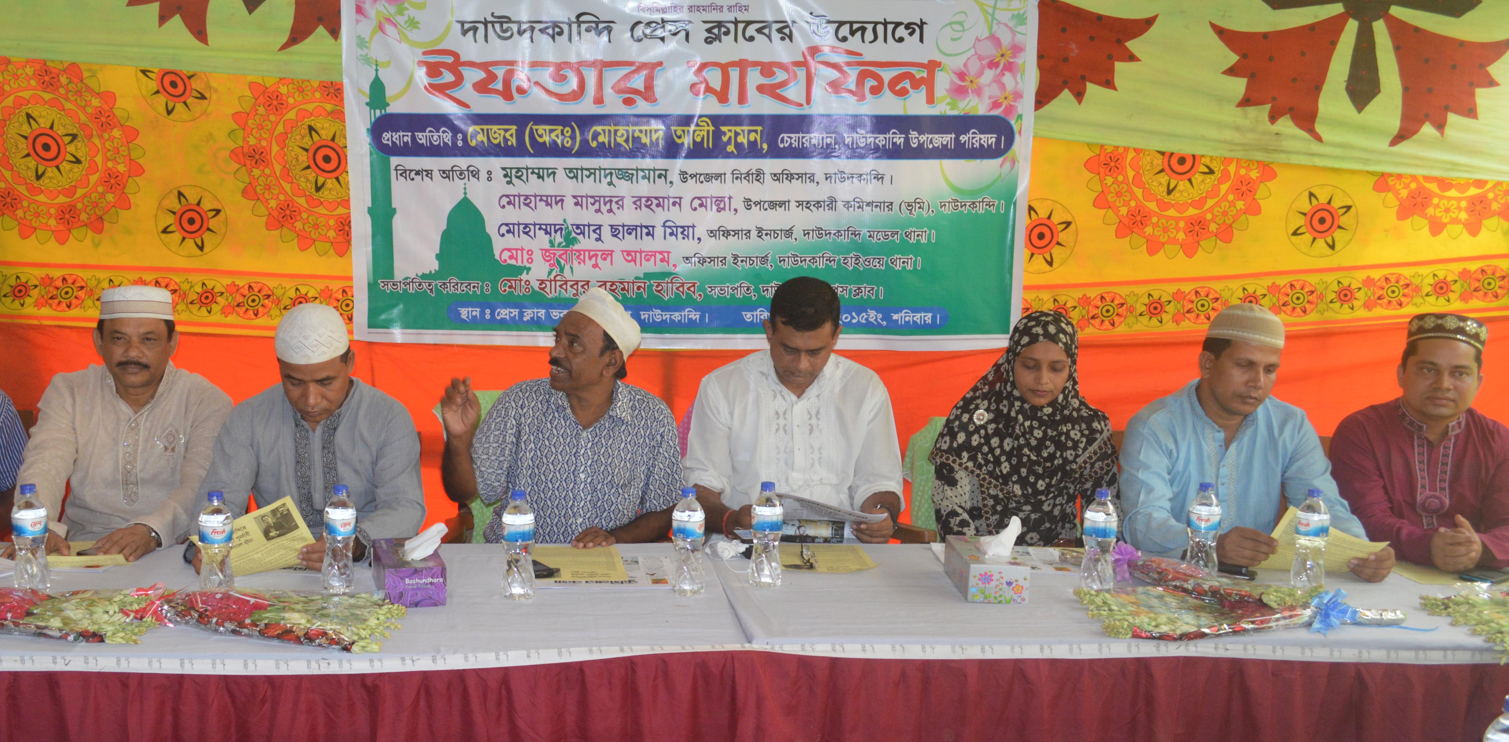 উক্ত অনুষ্ঠানে দাউদকান্দি প্রেস ক্লাবের সভাপতি মোঃ হাবিবুর রহমান হাবিবের সভাপতিত্বে প্রধান অতিথির বক্তব্য রাখেন, দাউদকান্দি উপজেলা পরিষদের নব নির্বাচিত চেয়ারম্যান মেজর (অব.) মোহাম্মদ আলী সুমন।