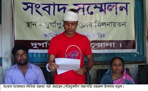 সংবাদ সম্মেলনে লিখিত বক্তব্য পাঠ করেন, সন্ত্রাসী হামলায় আহত যুবলীগ সভাপতি ও ড্রেজার বালু উত্তোলন ব্যাবসায়ী সমিতি নজরুল ইসলাম মড়ল। তিনি বলেন, সন্ত্রাসী মাজহারুল তাঁর দলবলসহ প্রকাশ্যে পিস্তল নিয়ে আমার উপর হামলা চালায়। বাজারে আতংক ছড়ানোর জন্য ৪টি ফাঁকা গুলি করে। তাঁর বাহিনীর তান্ডবে নাজিরপুর মোড়ে ওয়ার্কসপ ব্যাবসায়ী হযরত আলী, রিপন দে, আমজত খাঁ সহ একাধিক ব্যাক্তি আহত হয়।