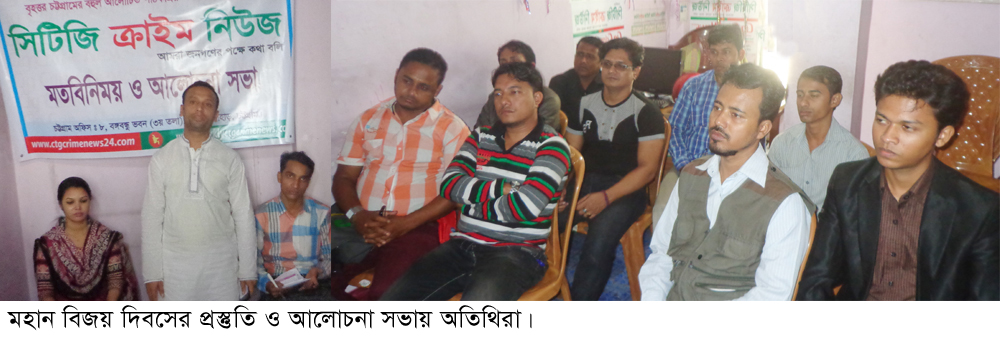 মহান বিজয় দিবস উদযাপন উপলক্ষ্যে বহুল আলোচিত পাঠকপ্রিয় অনলাইন ও সাপ্তাহিক সিটিজি ক্রাইম নিউজের প্রস্তুতি ও আলোচনা সভা গত ৫ নভেম্বর শনিবার চেরাগী পাহাড়স্থ বঙ্গবন্ধু কার্যালয়ে অনুষ্ঠিত হয়। এতে সভাপতিত্ব করেন সিটিজি ক্রাইম নিউজের প্রকাশক ও সম্পাদক আজগর আলী মানিক। উক্ত সভা কে.এম জাহেদ এর সঞ্চালনায় বক্তব্য রাখেন মোঃ বোরহান উদ্দীন, মোঃ শায়েক হোসেন, রাজীব শর্মা, মোঃ কামাল হোসেন। সভাপতির বক্তব্যে বলেন, লক্ষ শহীদের রক্তের বিনিময়ে মহান বিজয়। এই মহান বিজয়ে নতুন প্রজন্মকে সঠিক চেতনায় উৎজীবিত করতে হবে। এতে স্বাগত বক্তব্য রাখেন সহ-বার্তা সম্পাদক টকি চক্রবর্তী। এতে উপস্থিত ছিলেন, কবি এম. এ খালেক খান, কামাল উদ্দীন, রাশেদুল ইসলাম, জসিম উদ্দীন, ওসমান গণি, আরমান চৌধুরী, শফিউর রহমান প্রমুখ। উক্ত সভায় সকলের সম্মতিক্রমে বিজয় দিবসের দিন চট্টগ্রাম কেন্দ্রীয় শহীদ মিনারে পুষ্পস্তবক অর্পনের সিদ্ধান্ত গৃহিত হয়। পরে সকলকে ধন্যবাদ জানিয়ে সভাপতি সভা শেষ করেন।