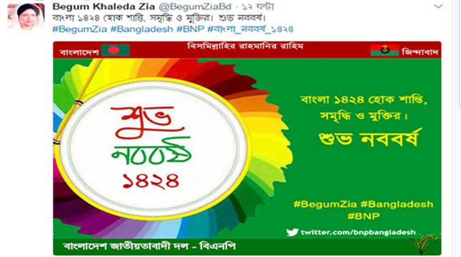 নববর্ষ উপলক্ষে পহেলা বৈশাখে দেশবাসীকে শুভেচ্ছা জানিয়েছেন বিএনপি চেয়ারপারসন বেগম খালেদা জিয়া। শুক্রবার সকালে সামাজিক যোগাযোগ মাধ্যম টুইটাইরের মাধ্যমে তিনি ওই শুভেচ্ছা জানা।