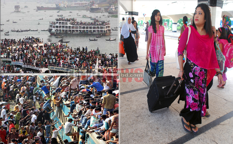 সড়ক ও রেলপথের চেয়ে নৌপথে তুলনামূলক ভিড় ছিল বেশি। সকাল থেকে যতই বেলা বাড়তে থাকে ভিড়ও ততই বাড়তে থাকে। দক্ষিণাঞ্চলের বিভিন্ন রুটর লঞ্চযাত্রী বোঝাই হয়ে ছেড়ে গেছে সদরঘাট লঞ্চ টার্মিনাল থেকে। বরিশালের যাত্রী ফরিদ আহমেদ পাটোয়ারি জানান, গত মঙ্গলবার সকালে তার এক আত্মীয়কে লঞ্চে উঠায়ে দিতে এসেছিল। সেদিন এতো ভিড়ছিলনা। সরকারি ছুটির দিন হওয়ায় বুধবার সদড়ঘাট লঞ্চ টার্মিনালে পা রাখার তিল ধারণের ঠাই নেই। তিনি বলেন, এমন অবস্থা চলবে ঈদের আগের দিন পর্যন্ত। সেই ভিড় এড়াতে আগাম যাত্রা তার। কিন্তু সেই দূর্ভোগ থেকে রক্ষা পেলেনা না তিনি।