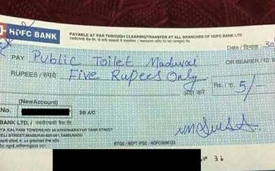 ভদ্রলোকের টয়লেট যাওয়ার বেগ পেয়েছিল বেশ। কিন্তু পকেটে খুচরা টাকা ছিল না। ছিল এইচডিএফসি ব্যাংকের চেক। কী আর করবেন, পাবলিক টয়লেট ব্যবহার করে বিল পরিশোধে পাঁচ টাকার চেক কেটে দিলেন তিনি। ভারতের মাদুরাইয়ে এ ঘটনা ঘটেছে।