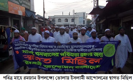 পবিত্র মাহে রমজান উপলক্ষে রমজানকে স্বাগত জানিয়ে স্বাগত মিছিল এবং মায়ানমারে রোহিঙ্গা মুসলিমদের উপর সন্ত্রাসী বৌদ্ধদের হামলা ও মায়ানমার রোহিঙ্গাদের নাগরিক স্বীকৃতির দাবীতে মিছিল ও সমাবেশ করেছে বাংলাদেশ ইসলামী আন্দোলন ভোলা জেলা।