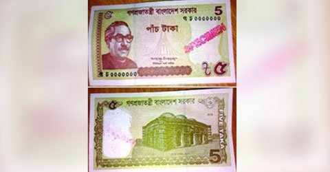 অর্থ বিভাগের সিনিয়র সচিব মাহবুব আহমেদ স্বাক্ষরিত ৫ টাকা মূল্যমানের নতুন কারেন্সি নোটটি হালকা বেগুনি রঙে মুদ্রণ করা হয়েছে। নোটটির সামনের অংশে বাংলাদেশের জাতীয় স্মৃতিসৌধ ও জাতির পিতা বঙ্গবন্ধু শেখ মুজিবুর রহমানের প্রতিকৃতি এবং পিছনের অংশে নওগাঁর কুসুম্বা মসজিদের ছবি রয়েছে।