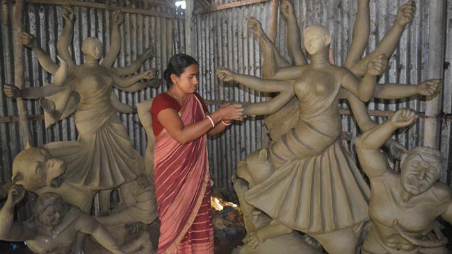 কাদা-মাটি, বাঁশ, খড়, সুতলি দিয়ে শৈল্পিক ছোঁয়ায় তিলতিল করে গড়ে তোলা দেবী দুর্গার প্রতিমা তৈরিতে দিনরাত ব্যস্ত সময় পার করছেন পাল পাড়ায় পুরুষের পাশাপাশি নারী কারিগররা।
