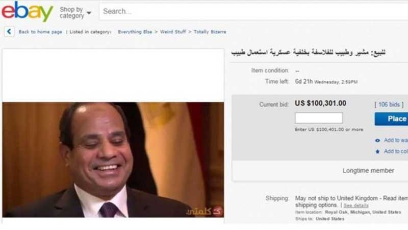 সম্প্রতি মিশরের অর্থনৈতিক দুরবস্থায় নিয়ে হতাশা ব্যক্ত করে নিজেকে বিক্রি করার কথা বলেছিলেন প্রেসিডেন্ট আবদুল ফাত্তাহ আল সিসি। সঙ্গে সঙ্গে তাকে নিলামে তুলে দেয় মিশরের কিছু কৌতুকপ্রিয় লোকজন। প্রেসিডেন্টকে বিক্রির জন্য তারা ফেসবুকে একটি পেজও খুলেছিল। সেখানে মাত্র কয়েক ঘণ্টার মধ্যেই সিসির দাম ওঠেছিল ১ লাখ ডলার। পরে অবশ্য পেজটি ফেসবুক থেকে সরিয়ে নেয়া হয়।