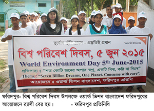 এদিকে বিশ্ব পরিবেশ দিবস উপলক্ষে ওয়াল্ড ভিশন বাংলাদেশ ফরিদপুরের আয়োজনে ত্রাণ ও দূর্য়োগ কর্মকর্তা নিউটন গোমেজ এর নেতৃত্বে একটি র্যালী বের হয়। র্যালিটি শহরের গুরুত্বপূর্ণ সড়ক প্রদক্ষিন শেষে জেলা প্রশাসকের কার্যালয়ের সামনে গিয়ে শেষ হয়। পরে জেলা প্রশাসকের কার্যালয়ের সম্মেলন কক্ষে আলোচনা সভা অনুষ্ঠিত হয়।