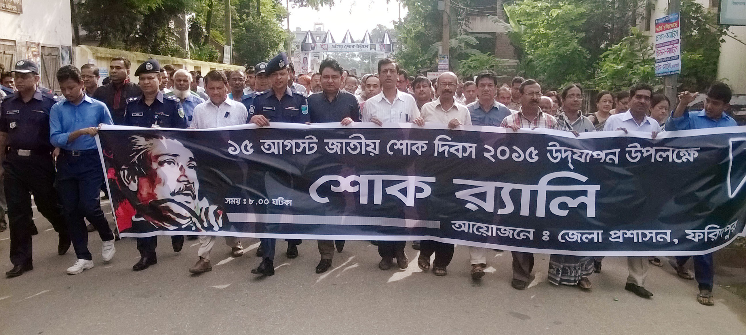 ফরিদপুরে ভোরের সূর্যোদের সাথে সাথে সকল সরকারী, আধা সরকারী, স্বায়ত্বশাসিত, শিক্ষা প্রতিষ্ঠান ও বেসরকারী ভবনসমূহে জাতীয় পতাকা অর্ধনমিত রাখা হয়। এরপড় সকাল ৮টায় ফরিদপুর জেলা প্রশাসকের কার্যালয় হতে জেলা প্রশাসকের নেতৃত্বে একটি শোক র্যালী শুরু হয়ে শহরের বিভিন্ন সড়ক প্রদক্ষিন শেষে অম্বিকা হলে গিয়ে শেষ হয়। যাতে দল মত নির্বিশেষে সবাই অংশগ্রহন করে।
