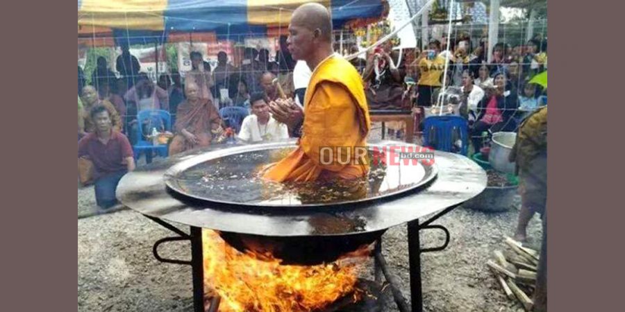 থাইল্যান্ডের ব্যাংকক পোস্ট আর যুক্তরাজ্যের ডেইলি মেইলে প্রকাশিত ছবিতে দেখা গেছে মুখে যন্ত্রণার তিলমাত্র নেই। বরং ছড়িয়ে আছে প্রশান্তি। ভিডিও ক্লিপে দেখা গেছে সন্ন্যাসী এক মনে ধ্যান করছেন ফুটন্ত তেলভর্তি পাত্রে। আর পাত্রটা চুলার গনগনে আঁচে বসানো!